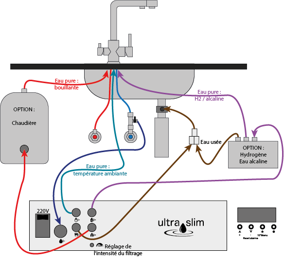 - Eau à température ambiante purifiée et trois variantes optionelles : eau à température ambiante, eau hydrogénée (en option), eau alcaline (en option), (eau chaude (en option) et eau reminéralisée (en option).